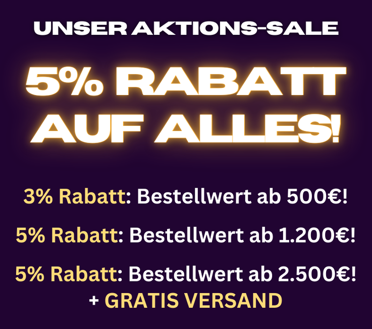 Mindestbestellwert: 400€ netto I GLS B2B pro Paket 6,99€ I Spedition: Ab 1.500€ netto Warenwert - 70€ I Ab 2.500€ netto Warenwert - Kostenloser Versand